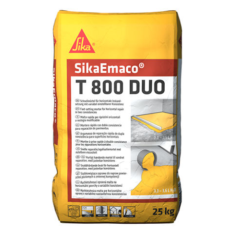 SikaEmaco® T 800 DUO ist ein 1-komponentiger, schnelltrocknender Zementestrich und Instandsetzungsmörtel für die horizontale Anwendung, welcher die Anforderungen nach DIN EN 1504-3 Klasse R4 erfüllt. SikaEmaco® T 800 DUO ist ein gebrauchsfertiges Material aus hydraulischen Bindemitteln, gut abgestuften Sanden und speziell ausgewählten Polymeren. Je nach Menge des zugegebenen Wassers kann der Mörtel erdfeucht / standfest oder verlaufend / gießfähig eingestellt werden: