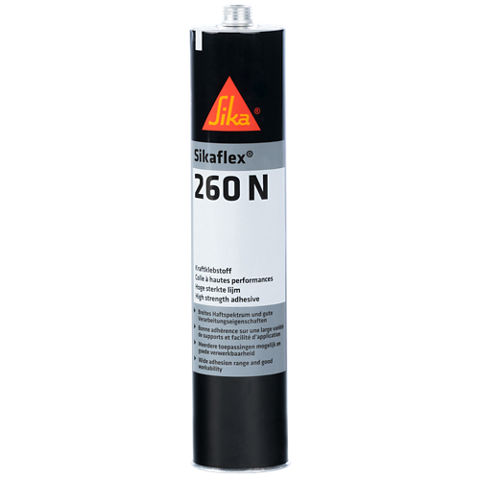 Sikaflex®-260 N ist ein einkomponentiger, universeller Klebstoff für die Scheibenverklebung sowie das Verkleben von großen Bauteilen im Fahrzeugbau. Geeignete Untergründe sind beschichtetes Metall, GFK, Keramik und Kunststoffe. Sikaflex®-260 N hat eine lange Offenzeit und kann daher bei warmen Umgebungsbedingungen sicher verwendet werden.