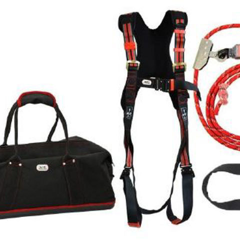 Das ABS PSA-Dachdecker-Set besteht aus Auffanggurt (Hosenträgergurt) mit Rückenöse (im Schulterbereich), einem variablen Verbindungsmittel (Seil), in den Längen 10 und 15 m (horizontale und vertikale Zulassung), mit Bandfalldämpfer, Seilkürzer und einer Aufbewahrungstasche.