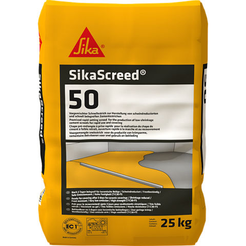 SikaScreed®‐50 ist ein vorgemischter Zementestrich zur Erstellung von schwundarmen, schnell begehbaren und belegreifen Zementestrichen in Wohn- und Gewerbebauten. Es sind schwindreduzierte Estriche mit einer Festigkeitsklasse