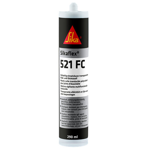 Sikaflex®-521 FC ist ein transparenter, witterungsbeständiger, einkomponentiger Dichtstoff, der durch Reaktion mit Luftfeuchtigkeit aushärtet. Sikaflex®-521 FC zeigt eine gute Haftung auf einer Vielzahl von Untergründen wie Metallen, Kunststoffen und Holz. Normalerweise ist keine oder nur eine einfache Oberflächenvorbehandlung erforderlich. Nach dem Aushärten bildet der Dichtstoff eine dauerhafte elastische Verbindung.