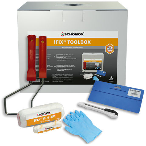 Mit dem rollfähigen Dichtkleber SCHÖNOX iFIX® empfehlen wir die SCHÖNOX iFIX® TOOLBOX.