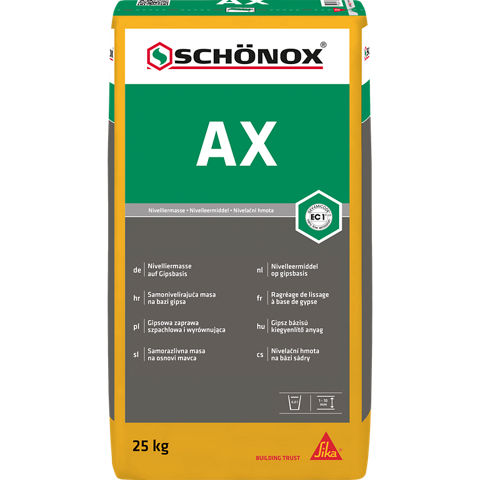 Besonders geeignet auf allen calciumsulfatgebundenen Untergründen sowie auf Gussasphaltestrichen nach DIN 18 560. Auch auf zementären Untergründen im Innenbereich einsetzbar. Nach Zugabe von 6,0 l Wasser auf 25,0 kg Pulver ist SCHÖNOX AX gebrauchsfertig.
