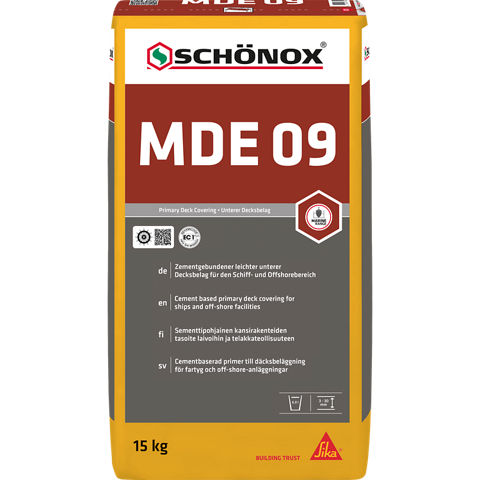for use at a density of 0,7 - 0,9 kg/dm³. The screed can be laid directly on to shop-primed steel substrates without further priming. The weight of SCHÖNOX MDE 09 can be reduced further by extending up to 35 % Poraver® (0,5 - 1,0 mm). SCHÖNOX MDE 09 complies with MED Directive 2014/90/EU.